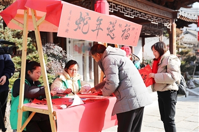 上午10时,青溪老街上已人头攒动。望海楼前的非遗民俗活动区尤为热闹,写“福”字摊位前围满了游客。两位学生志愿者挥毫泼墨,不仅书写传统福字,还融入生肖蛇元素或个性化祝福语,吸引不少市民驻足。“我们就住在附近,骑车十几分钟就到,顺路来吃早饭,还能带个福字回家,讨个好彩头。”(下转4版)  (上接1版)一位游客笑着说道。另一名游客则表示:“这是‘送福’,也是‘纳福’,希望新年平安健康。”