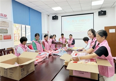 居委会“爱心妈妈”编织班成立至今,已为贫困山区儿童捐献550件毛衣,180条围巾。