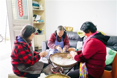 清洗完一篮子的麻花郎,去除白色的根茎,便可以下锅焯水,再加以石灰煮透煮烂,便有了制作青团的的原材料。这时候,盛桂花的家里热闹起来了。三五邻里好友齐聚一堂,挽起袖子,揉面团、拌馅料、热灶头,制作起一年一度的青团。今年还是如往年一般制作两种口味的青团,白色加入当季春笋拌猪肉馅儿,青色则是绵密的豆沙馅。阿姨们围坐在一起,搓青团、夹花、摆盘、点缀红丝、上锅蒸煮。