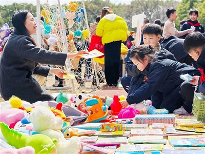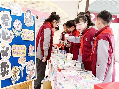 上海大学附属奉贤实验学校以“山海共明月,千里寄温情”为文化内核,打造公益品牌,将地域情怀融入德育实践。学校通过“班级特色摊位+多元功能区”创新义卖模式:学生化身“公益设计师”,以盲盒套圈、漆扇手串等创意形式传递爱心;教师爱心区、花币兑换区(云南明信片慢“邮”)及“山海心愿墙”构建沉浸式公益场景,实现寓教于乐。家长、师生共绘公益同心圆,以特色实践培育学生家国情怀,让“山海温情”跨越千里,书写五育融合新篇章。